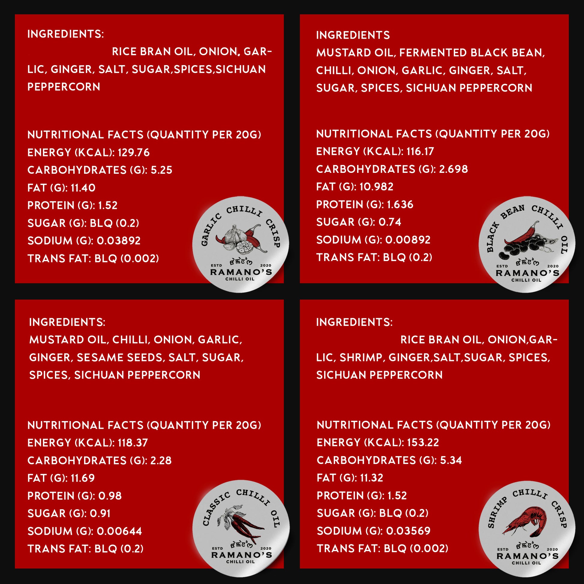Discover a world of bold flavours with Ramano’s specially curated Chilli Oil Gifting Set. Unleash flavours with Ramano's OG chilli oil, Fiery OG chilli oil, Garlic chilli crisp, Classic chilli oil, Black bean chilli oil, Garlic crunch chilli crisp, Honey chilli, and Shrimp chilli crisp. Elevate every regular dish into a spicy and delicious masterpiece with our versatile chilli oil collection.