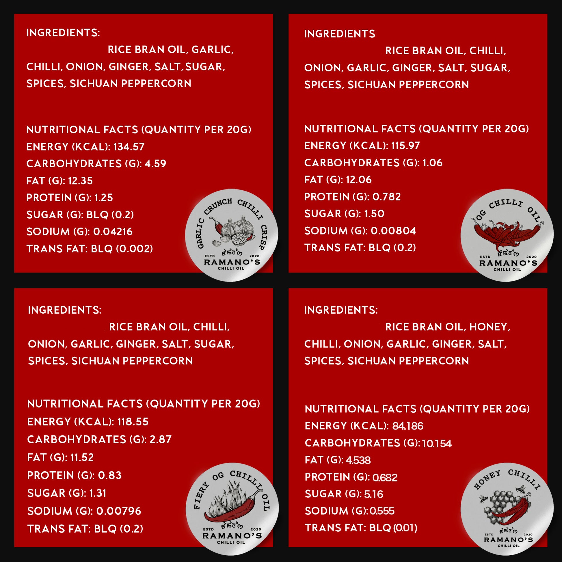 Rice bran oil, Honey, Chilli, Onion, Garlic, Ginger, Salt, Spices, Sichuan peppercorn